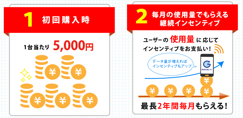 GLOCALNETのアフィリエイトプログラムでは、ユーザーが1台購入するごとに、以下の2つのインセンティブが得られます。